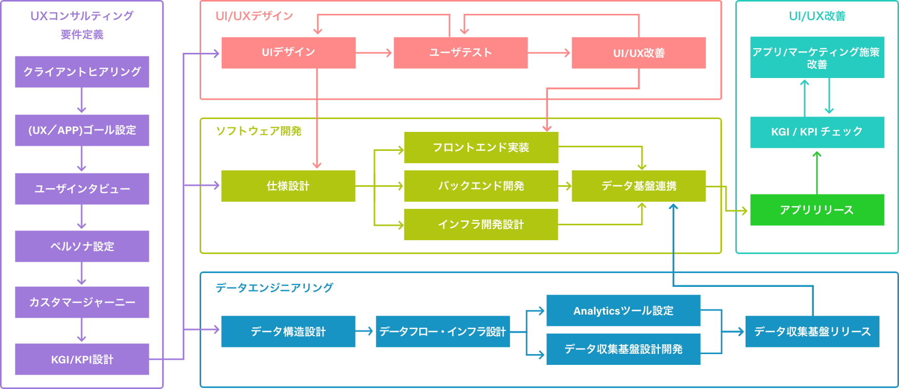 ここでは、この中で、前半の「UXコンサルティング/要件定義」と後半の「UI/UX改善」について詳しくご説明させていただきます。